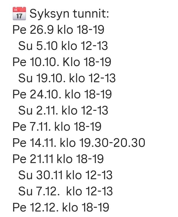 Syksyllä on mahdollista osallistua kehonhuoltotunneille myös perjantaisin ja sunnuntaisin! Tunnit järjestetään keskimääräisin joka toinen perjantai klo 18-19 ja joka toinen sunnuntai klo 12-13.