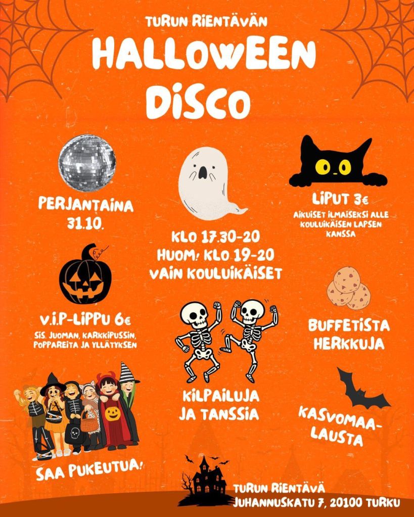 🎃 klo 17.30-19 ovat kaikki lapset tervetulleita discoilemaan ja klo 19-20 disco jatkuu vain kouluikäisille lapsille. Alle kouluikäisillä lapsilla täytyy olla huoltaja mukana.