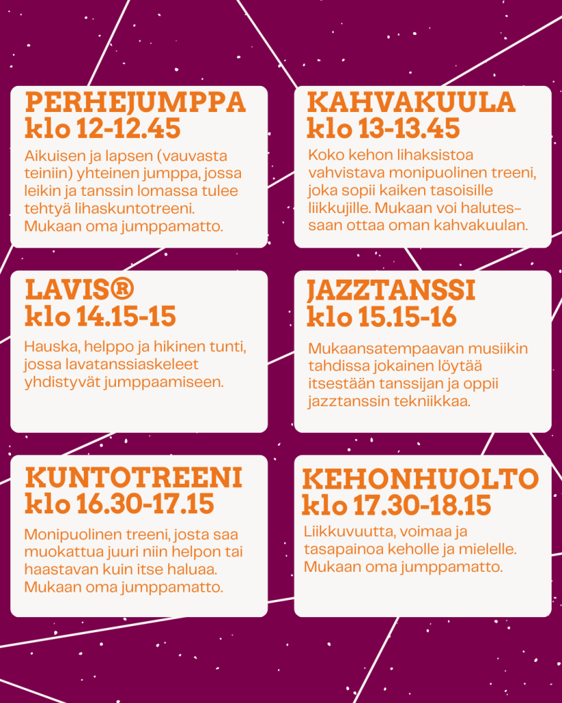 Päivän aikana Rientävällä on kuusi eri liikuntatuntia, joihin voi osallistua. Tunnit ovat Rientävän lukujärjestyksestä löytyvät aikuisliikuntatunnit ja ne myös ohjaa tutut Rientävän ohjaajat.