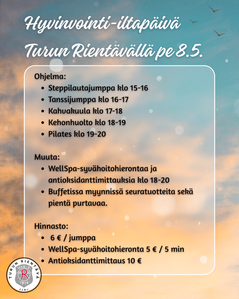 Liput myynnissä 6€/h. Ilmoittaudu Hyvinvointi-iltapäivän jumppiin tästä.